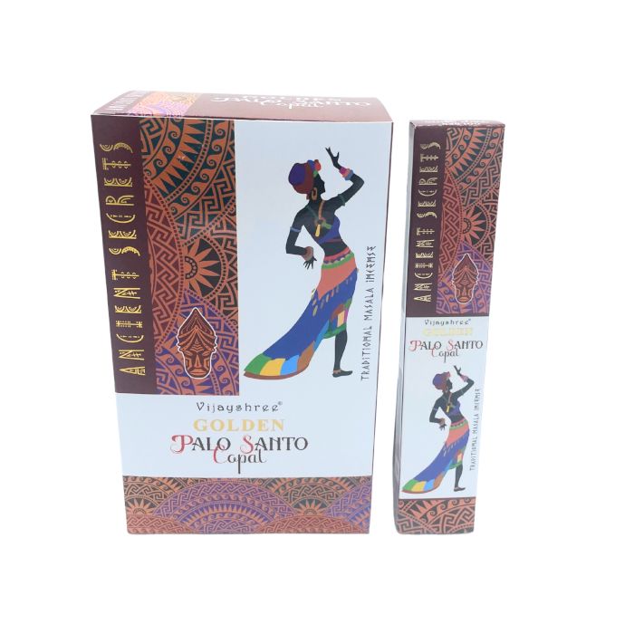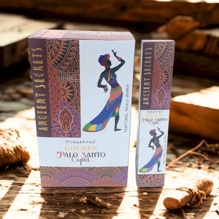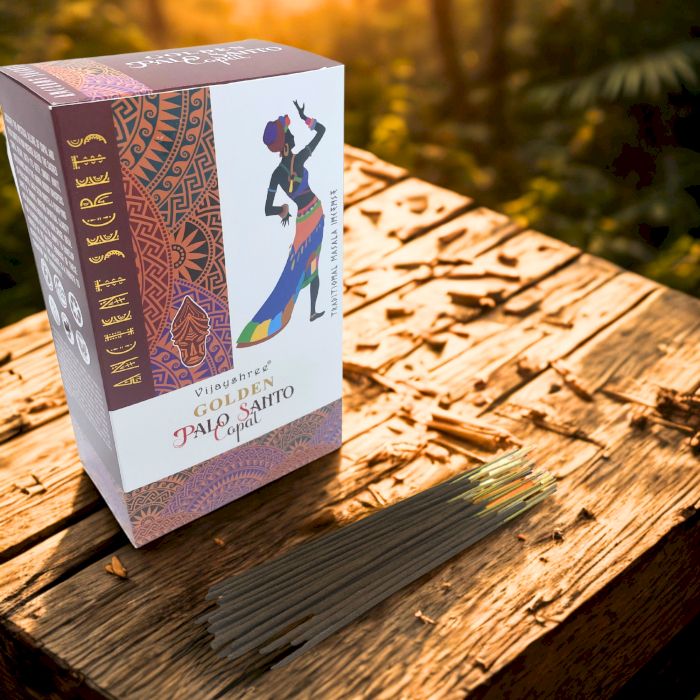 - Materialien/Inhaltsstoffe: Hochwertige Goldene Copal-Räucherstäbchen und reines Palo Santo Holz.