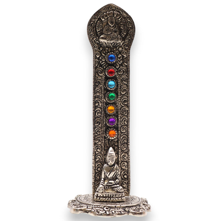 7 Chakra Turm Buddha Räucherstäbchenhalter mit poliertem Aluminium – ideal für Meditation, Yoga und spirituelle Auszeiten.