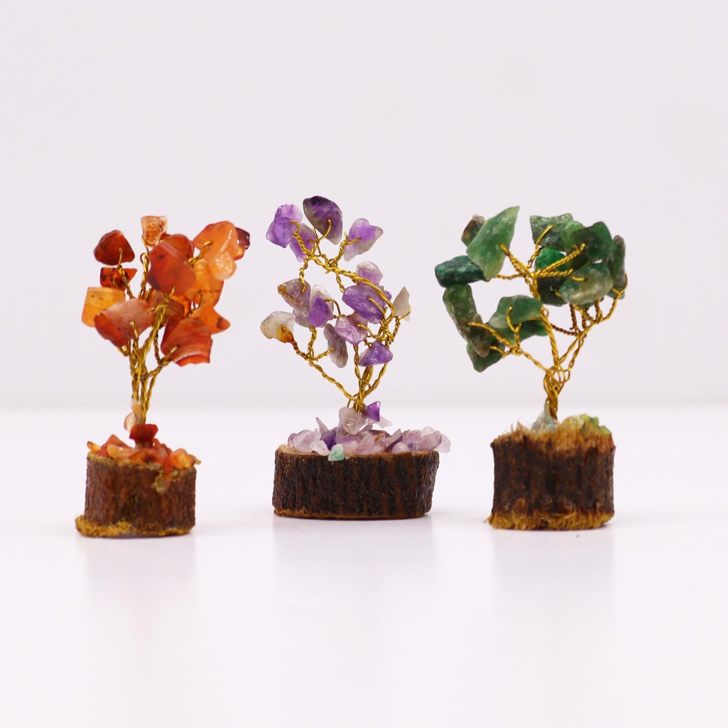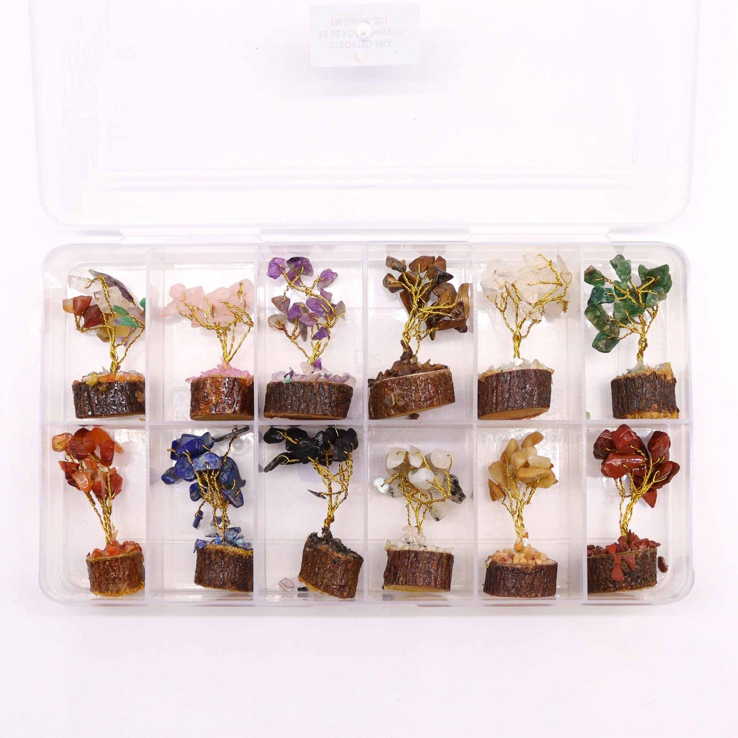 Box Mit 12 Mini Edelstein Bäumen Auf Holzbasis - Verschiedene Sorten Mit 15 Steinen