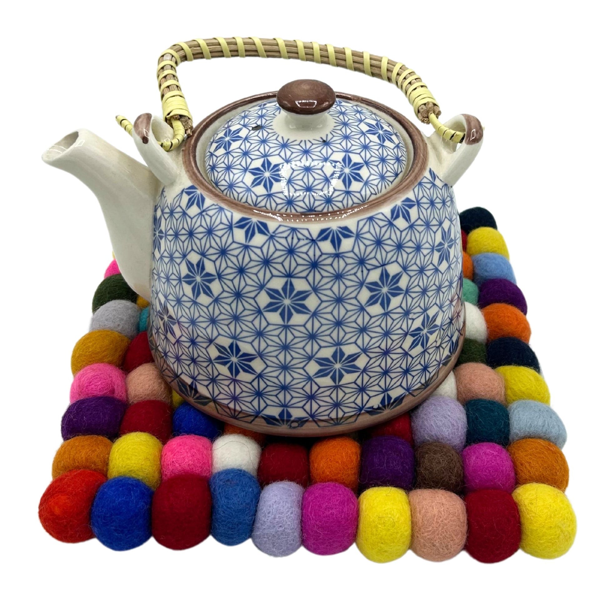 Filzball Platzmatte in Quadrat-Form mit leuchtenden Farben – ideal für designbewusste Küchen und festliche Tafeln.