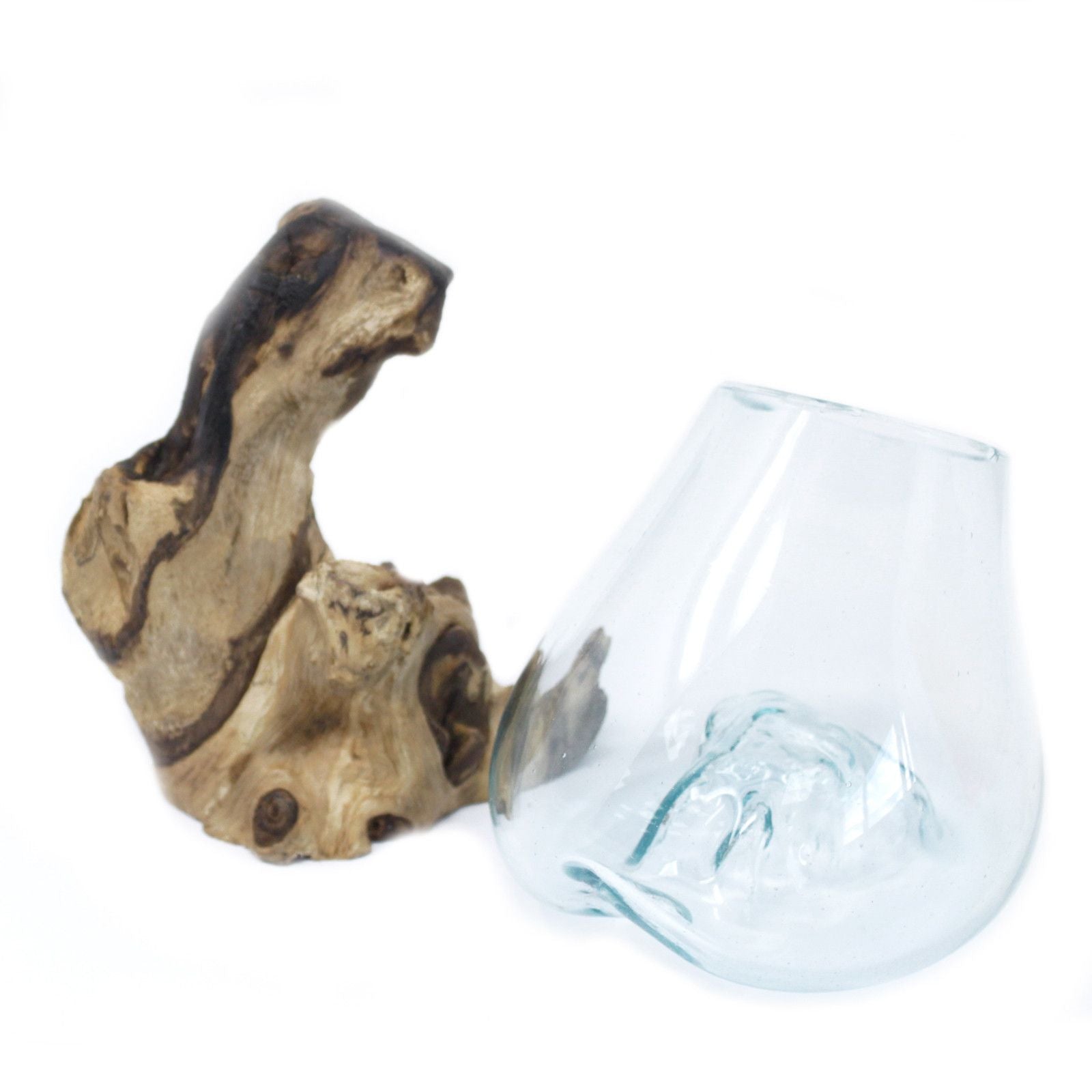 Mittelschale aus geschmolzenem Glas auf Holz – einzigartiges Design für Pflanzenliebhaber und Deko-Fans.