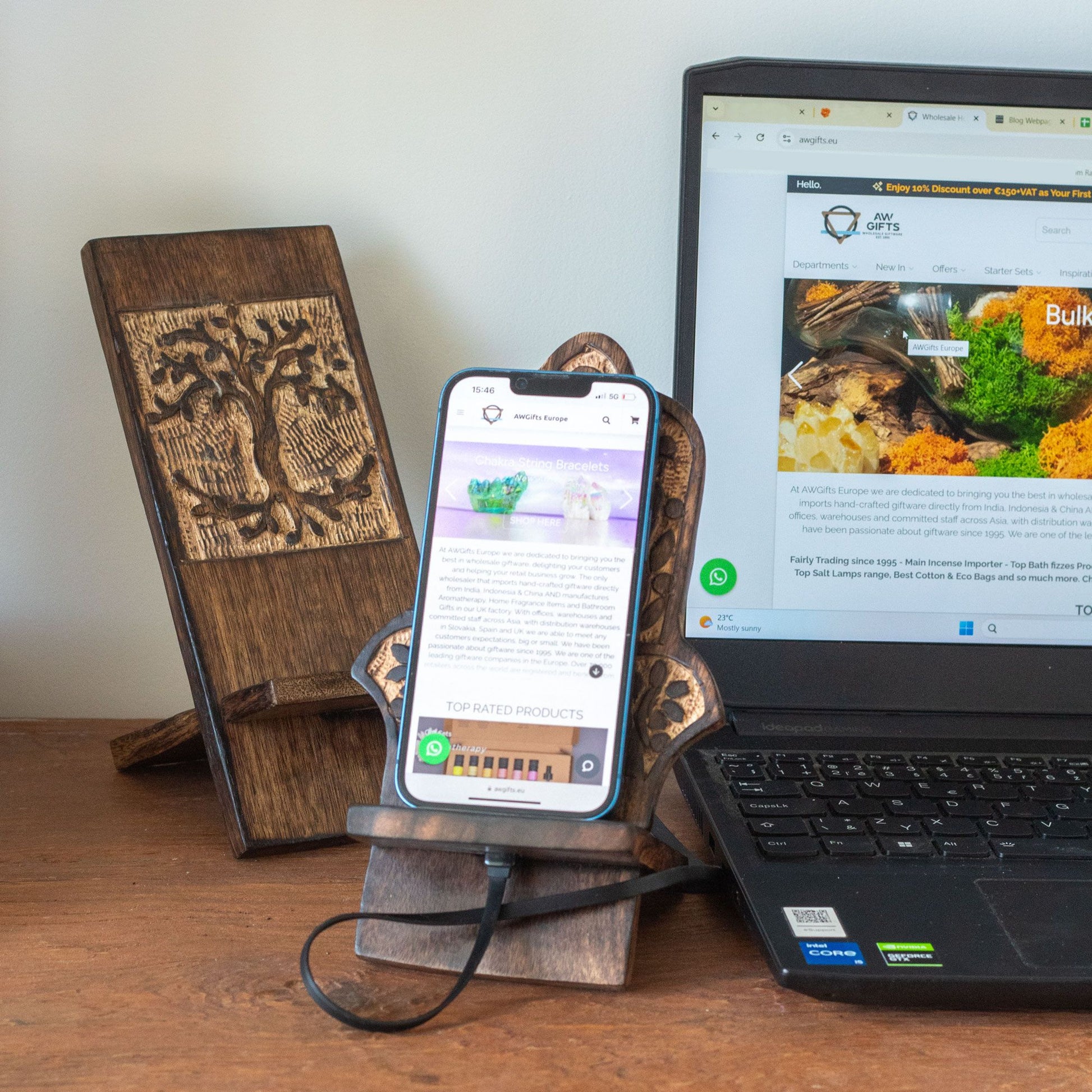 Handgeschnitzter Handyhalter aus Mangoholz mit Mandala-Design – ideal für spirituelle Räume und stilvolles Home Office.