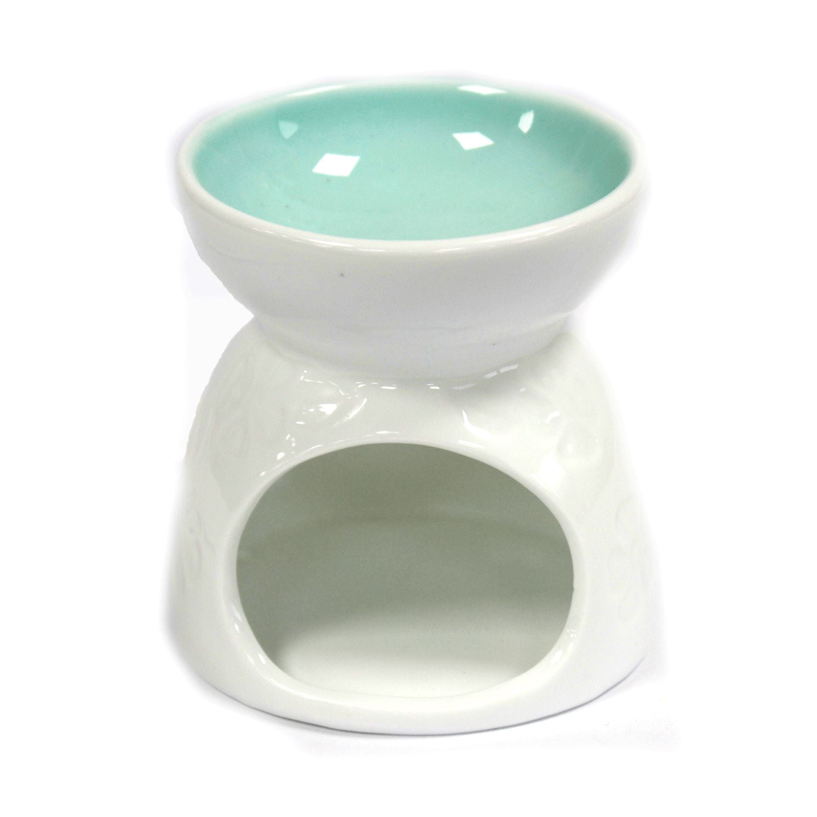 Klassischer Weißer Ölverdampfer mit floralem Design und Teal Schale – ideal für entspannte Wohlfühlmomente und stilvolle Wohnakzente.