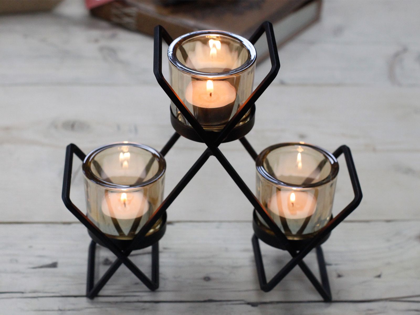 - Materialien/Inhaltsstoffe: Robustes Eisen mit drei Glastassen für Teelichter.