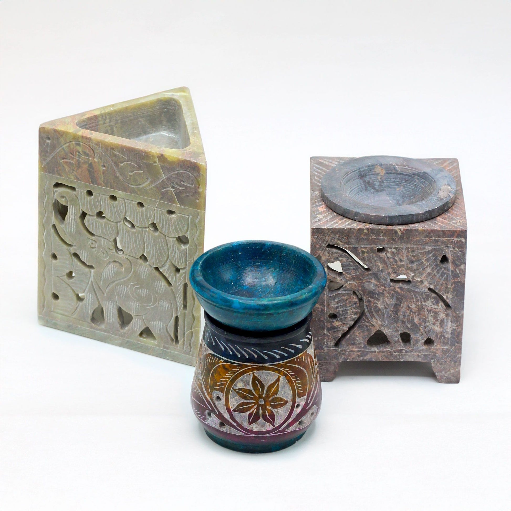 Quadratischer Seifenstein Ölbrenner mit kunstvollen Elefantenverzierungen – ideal für entspannende Abende und Meditationsräume.