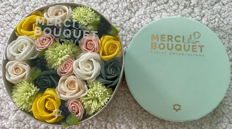 - Materialien/Inhaltsstoffe: Hochwertige Pappe und handgefertigte Seifenblumen aus natürlichen Inhaltsstoffen.
