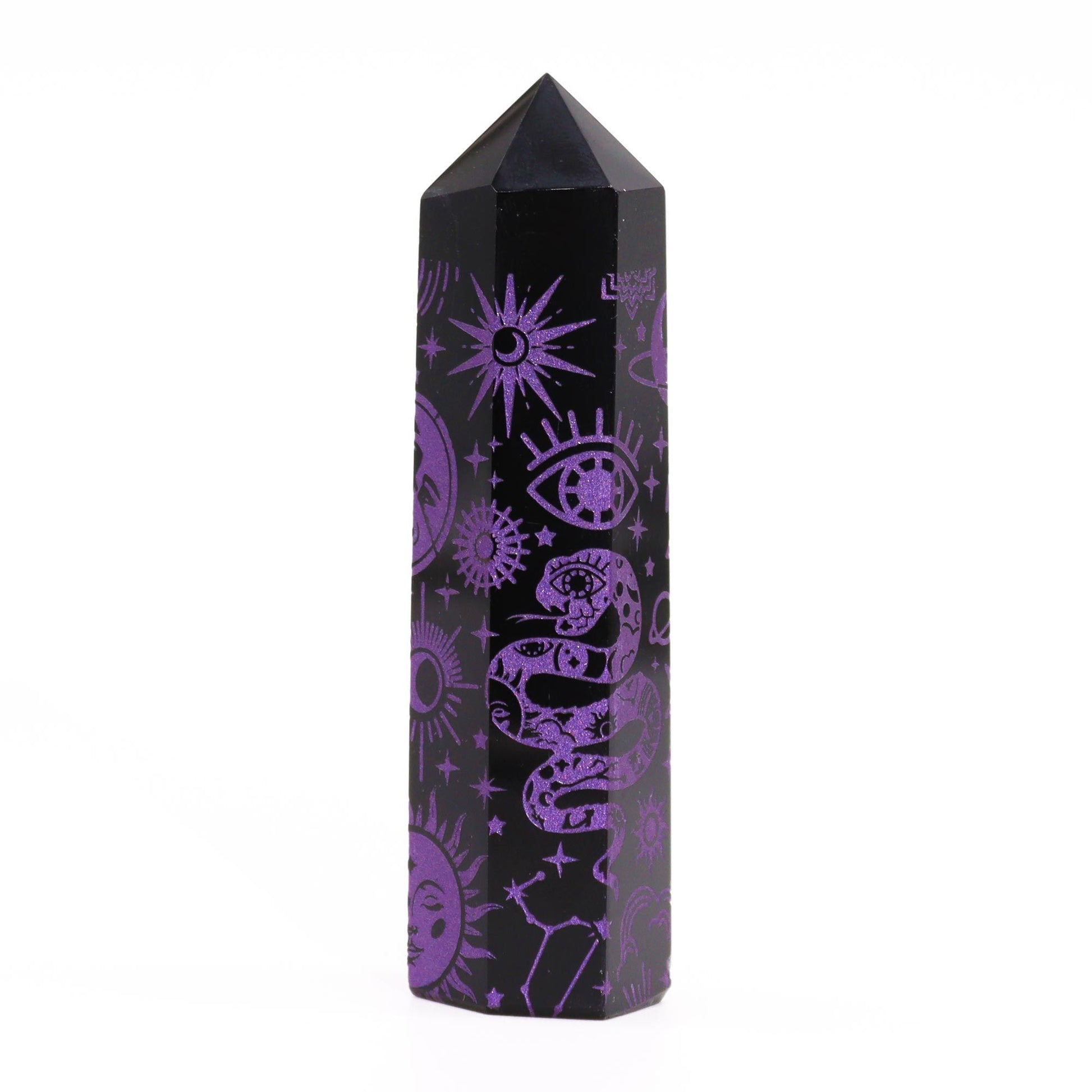 Unser lila Obsidian Obelisk bringt nicht nur eine mystische Ausstrahlung in Ihr Zuhause, sondern auch eine schützende Energie, die Sie bei Meditation und spiritueller Arbeit unterstützt. Engraviert mit kunstvollen Symbolen von Sonne, Mond und Sternen, fördert dieses Stück eine tiefere Konzentration und hilft, negative Energien abzuwehren. Perfekt für alle, die nach innerer Ruhe und Klarheit suchen.