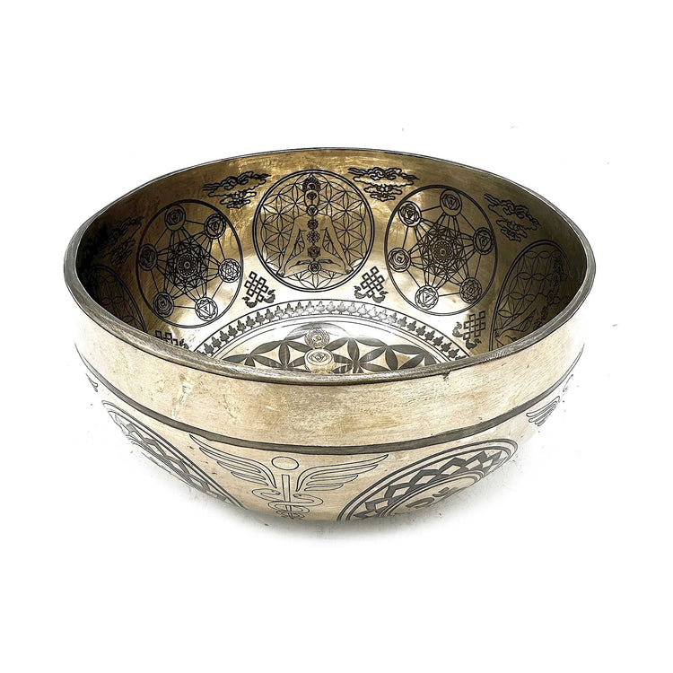 Die Tibetische Heilende Gravierte Schüssel mit einem Durchmesser von 16 cm und 7 Chakra-Symbolen ist ideal für Yoga-Praktizierende und Meditiationsliebhaber. Diese Schüssel verkörpert die spirituelle Tiefe des Himalayas und ist speziell dafür entworfen, Harmonie und Balance in Ihr Leben zu bringen.