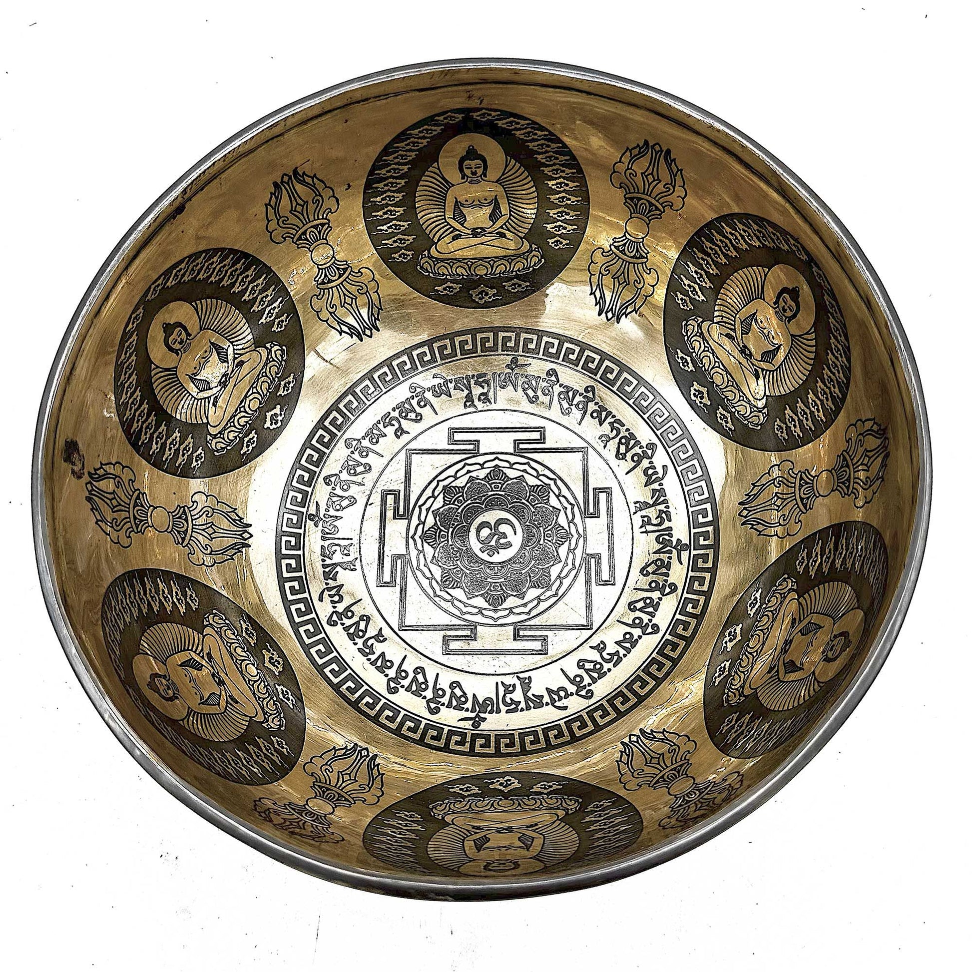 Die Tibetische Heilende Gravierte Schüssel mit einem Durchmesser von 21 cm und einer kunstvollen Gravur von Om und Buddha – ideal für spirituelle Praktiken, Meditation und als einzigartiges Geschenk.
